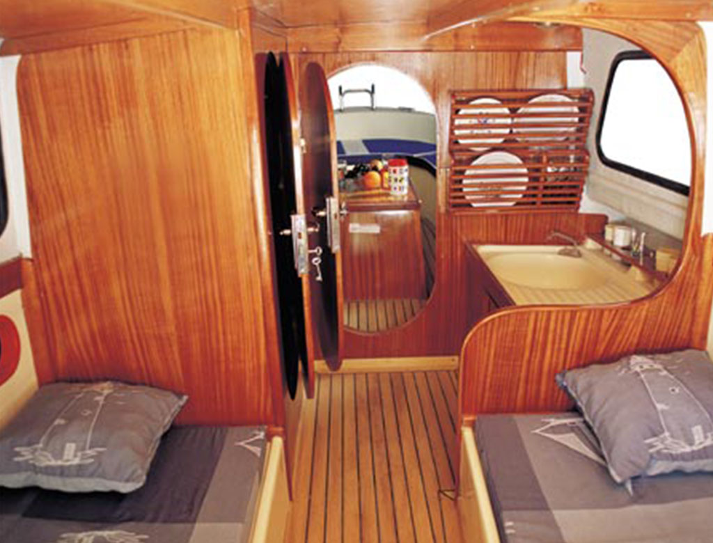Stainless steel shaft, lubricating nipple, gasket, brass propeller, chrome-nickel rudder range, plexiglass chamber windows, securit hood windows, opening window giving access to deck from cabin other lockers with hinged lid, mahogany veneered bulkheads, cabin door with lock, double bed space, exit hatch cover to the deck 3 hinged compartments suitable for storing materials, chain holder and hinged cover, chrome-nickel front railing, chrome-nickel ladder, wooden motor case, wooden headlights, portable WC, kitchen cabinet and sink, faucet-booster-water tank and connection, bilge pump and its connection, pier-starboard light, cabin lamp, electrical installation, switches and fuses, engine assembly, valve in engine connection, exhaust system outlet, water lock, goose neck, hoses / clamps / connection, steering wheel / system and cable , remote control system and cable, fore chain roller, cleats, stainless steel U shaped towing hook, inner and outer cushions, 25 liter fuel tank, flag pole, battery, battery circuit breaker.